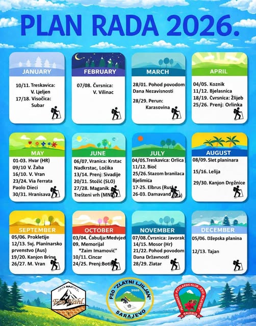 Kalendar tura, uspona i planinarskih druženja — od zimskih izazova do ljetnih ekspedicija.